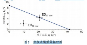 根據文獻,采用等輻射方 法分析瑞芬太尼與丙泊酚鎮痛作用的相互影響,即 將瑞芬太尼的 ED50標在橫坐標上,丙泊酚的 ED50標 在縱坐標上,標注其可信區間,兩點相連即為相加 線,并把兩藥合用的 ED50 標在坐標上,根據所在位 置判斷其相互影響,如合用時的 ED50落在相加線的 左側則兩藥為協同作用,如落在相加線右側則兩藥 為拮抗作用,如落在相加線上則為相加作用。采用 Algebraic 法分析聯合用藥組中瑞芬太尼和丙泊酚的 ED50分別占單用藥時 ED50的分數之和( 相互作用指 數,γ) ,從而判定兩藥間的相互影響: γ = ED50 mix / ED50 remifentanil + ED50 mix /ED50 propofol,ED50mix為實際測量 值。γ = 1 為相加效應; γ > 1 為拮抗作用; γ < 1 為協 同作用。ED50 理論值( ED50 add ) = f × ED50 remifentanil + ( 1-f) × ED50 propofol,其中 f = 0. 5。