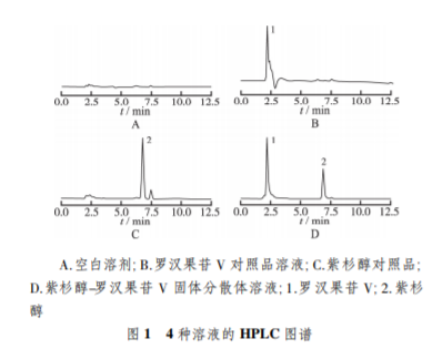 分別取空白溶劑、羅漢果苷 V 對 照品溶液、紫杉醇對照品溶液和紫杉醇-羅漢果苷 V 固 體分散體溶液,按“2.3.1”條件,進行 HPLC 分析,紫杉 醇典型色譜圖見圖 1。結果表明,在本色譜條件下,紫 杉醇峰形良好,保留時間約為 6.8 min,空白溶劑和羅 漢果苷 V 對主峰的測定無干擾。