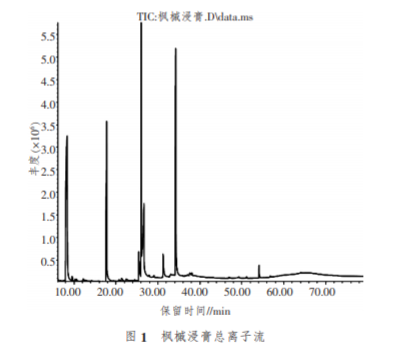 楓槭別名雞爪楓、槭樹,為槭樹科槭樹屬,主要 生長在美國和加拿大等美洲國家, 在中國長江流域 也有分布。 采用一定濃度的乙醇萃取楓槭樹皮等部 位,將溶劑去除獲得楓槭浸膏,楓槭浸膏為深褐色膏 體,具有強烈的焦糖香氣,可以用作食品添加劑以增 加烘烤、焦甜香。作為煙用香料,能夠提高煙香、矯正 卷煙吸味,增加卷煙自然清甜,改善卷煙余味,改善 干、澀、苦的口感 。 對楓槭浸膏揮發性成分有關報 道較少,蘇東贏將楓槭浸膏在不同溫度下進行熱 裂解,因為在裂解過程中會發生熱解、加成等復雜的 化學反應,沒 有對楓槭浸 膏揮 發 性 成 分 進 行 分析,不能表征楓槭浸膏的化學成分。通過對楓槭浸膏 揮發性成分進行鑒定, 旨在明確楓槭浸膏揮發性成 分種類及含量, 以期為楓槭浸膏合理使用提供數據支撐。