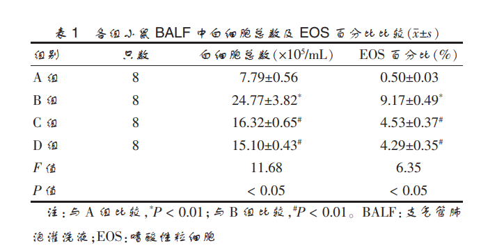 A 組小鼠氣道黏膜無增厚,氣道周圍無炎癥細(xì)胞 浸潤,肺泡壁結(jié)構(gòu)完整;B 組小鼠氣道黏膜充血水腫, 氣道周圍較多炎癥細(xì)胞浸潤,肺泡結(jié)構(gòu)被破壞;C 組 小鼠氣道周圍少量炎癥細(xì)胞浸潤,管壁無明顯增厚; D 組小鼠程度與 C 組小鼠相似。 見圖 1(封四)。2.3 各組小鼠 BALF 中白細(xì)胞總數(shù)和 EOS 百分比的 比較 與 A 組比 較,B 組小 鼠 BALF 中白 細(xì) 胞 總 數(shù) 和 EOS 百分比均顯著升高,差異有高度統(tǒng)計學(xué)意義(P < 0.01)。 與 B 組比較,C 組和 D 組小鼠 BALF 中白細(xì)胞 總數(shù)及 EOS 百分比明顯降低,差異有高度統(tǒng)計學(xué)意 義(P < 0.01)。C、D 兩組白細(xì)胞總數(shù)和 EOS 百分比比較, 差異無統(tǒng)計學(xué)意義(P > 0.05)。 見表 1。
