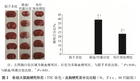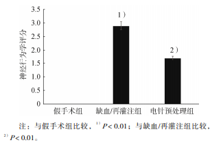 假手術(shù)組無神經(jīng)功能喪失;缺血/再灌注組神經(jīng) 行為學(xué)改變明顯,大鼠左前肢明顯不能充分伸展, 或向左環(huán)行運動,出現(xiàn)輕度局灶神經(jīng)功能喪失,或 向左側(cè)倒,出現(xiàn)中度局灶神經(jīng)功能喪失;電針預(yù)處 理組神經(jīng)行為學(xué)癥狀較缺血/再灌注組明顯減輕。 缺血/再灌注組神經(jīng)行為學(xué)評分明顯高于假手術(shù)組 (P<0.01);缺血/再灌注組和電針預(yù)處理組神經(jīng) 行為學(xué)評分分別為 2.95±0.22 和 1.75±0.64,電針 預(yù)處理組明顯低于缺血/再灌注組(P<0.01)。見 圖 1。