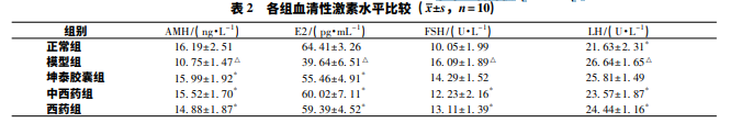 給予雷公藤多苷片的 55 只大鼠呈現不同 程度的動情周期紊亂,表現為延長與停滯。連續灌胃 2 周 后,46 只大鼠出現連續動情周期紊亂,造 模 成 功 率 為 83. 6%; 2 周治療結束后,陰道脫落細胞涂片顯示 28 只大 鼠動情周期恢復 ( 28 /46,60. 9%) ,其中模型組 3 只 ( 3 / 11,27. 3%) ,西藥組 8 只 ( 8 /11,72. 7%) ,坤泰膠囊組 8 只 ( 8 /12,66. 7%) ,中西藥組 9 只 ( 9 /12,75%) 。與正常組比較,模型組 血清 AMH、E2 水 平 顯 著 降 低,LH、FSH 水 平 顯 著 升 高 ( P<0. 05) ; 與模型組比較,坤泰膠囊組、中西藥組、西藥 組 AMH、E2 水平顯著升高 ( P<0. 05) ,中西藥組、西藥組 FSH、LH 水平顯著降低 ( P<0. 05) 。