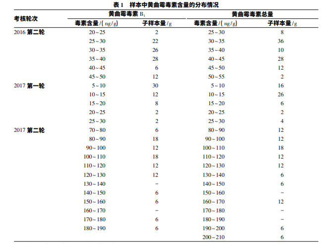 樣品中黃曲霉毒素 B1 及其總量的含量與樣 品的取樣范圍有關,考核中 2 g 為 1 份子樣品,表1 為比對考核中樣本中黃曲霉毒素含量的分布 情況。