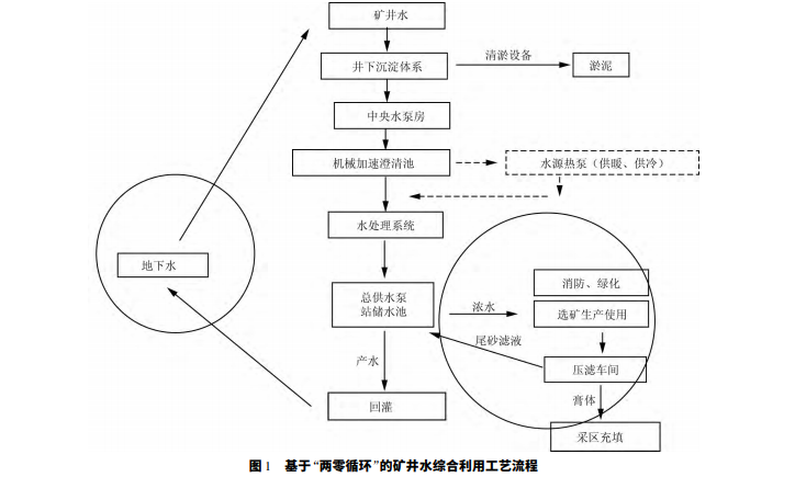 為了解決中關(guān)鐵礦礦井水綜合利用的問(wèn)題,針 對(duì)礦井水產(chǎn)生過(guò)程、排放流程和整個(gè)生產(chǎn)系統(tǒng)的工藝特點(diǎn),對(duì)各個(gè)用水環(huán)節(jié)均進(jìn)行了詳細(xì)梳理,提出了 礦井水“兩零循環(huán)”綜合利用模式。“兩零循環(huán)”中 的第一個(gè)“零”是指地下水通過(guò)巖石裂隙進(jìn)入采區(qū) 形成礦井水,經(jīng)過(guò)井下排泥系統(tǒng)梯級(jí)沉淀除去固體 雜質(zhì),經(jīng)過(guò)中央水泵房集中排出地表,在地表經(jīng)過(guò)3# 機(jī)械加速澄清池進(jìn)一步凈化,經(jīng)過(guò)水源熱泵提取水 中蘊(yùn)含的低品位熱量,然后進(jìn)入水處理系統(tǒng),轉(zhuǎn)變?yōu)槿愃畼?biāo)準(zhǔn)后經(jīng)過(guò)管道全部回灌入地下,達(dá)到礦井 水來(lái)自地下含水層又回到地下含水層的目的,從而 實(shí)現(xiàn)礦井 水 的 零 排 放。“兩零 循 環(huán)”中 的 第 二 個(gè) “零”是指生產(chǎn)用水經(jīng)過(guò)總供水泵站的環(huán)水泵、加壓 泵進(jìn)入選礦系統(tǒng),作為生產(chǎn)用水在選廠參與一系列 選礦作業(yè),形成攜帶礦砂的礦漿水,攜帶尾砂進(jìn)入壓 濾車間,經(jīng)過(guò)壓濾設(shè)備實(shí)現(xiàn)泥水分離,最后濾液經(jīng)過(guò) 管道泵再次回到總供水泵站,從而實(shí)現(xiàn)生產(chǎn)用水的 閉環(huán)循環(huán),同時(shí)生活用水也經(jīng)過(guò)類似的過(guò)程實(shí)現(xiàn)相 應(yīng)的閉環(huán)循環(huán),實(shí)現(xiàn)生產(chǎn)生活廢水的零排放。優(yōu)化 后的中關(guān)鐵礦基于“兩零循環(huán)”的礦井水綜合利用 工藝流程如圖 1 所示。