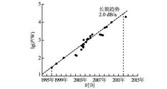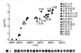 1993年,HongPo等人研制出摻釹雙包層光纖 激光 器。2002 年,J.Limpert 等 人 研 制 出 鉺 鐿 (Er3+/Yb3+ )共摻的雙包層光纖激光器,實現(xiàn)了150 W 的單模連續(xù)激光功率輸出,大大推動了高功率摻 鐿光纖激光器的開發(fā)。2009年,光纖激光器的全球 領(lǐng)跑者IPG 公司基于同帶泵浦技術(shù)使用1.018μm 的激 光 作 為 泵 浦 光,首 次 實 現(xiàn) 了 單 纖 單 模 輸 出 10 kW,光束 質(zhì) 量 因 子 M2 <1.31。2012年,IPG 公 司的單纖單模功率達(dá)到了20kW。截至2019年 1月,IPG 公司 的 光 纖 激 光 器 最 高 輸 出 水 平 為 單 模 20kW 與多模500kW。圖1示出了國外光纖激光 器單纖單模激光功率P 的提升情況,可以看出從 1997年至2012年,光 纖激光器的單纖單模輸出功 率水平的提升大致為2.0dB/a,約合1.58倍/a。