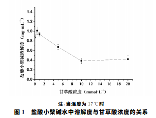 如圖1所示,選用不同濃度甘草酸后,隨著濃度的增加, 鹽酸小檗堿溶解度隨之下降。當(dāng)甘草酸濃度為10mmol·L-1 時,此時鹽酸小檗堿的溶解度最低,與純水中的溶解度相比, 溶解度下降了2.3倍。繼續(xù)加大甘草酸的濃度后,鹽酸小檗 堿的溶解度變化不明顯。