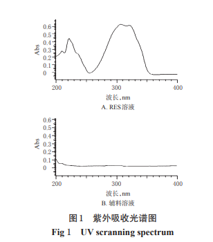 取干燥至恒質量的 RES 對照品適量,置于量瓶中,加 1%醋酸 10 mL,超聲(功 率:180 W,頻率:59 kHz,時間:2 min,下同)溶解,并用 無水乙醇稀釋成質量濃度為5 μg/mL的溶液,同法配制 相應濃度的輔料溶液,采用紫外分光光度法,在 200~ 400 nm 波長范圍內進行紫外掃描。結果顯示,RES 在 307 nm波長處有最大吸收,輔料對其測定無干擾,故選 擇307 nm 波長作為 RES 的含量測定波長,紫外光譜圖 見圖1。