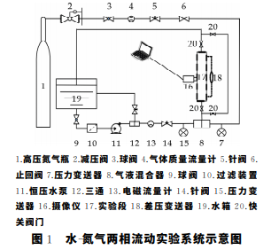 為滿(mǎn)足實(shí)驗(yàn)條件,作者設(shè)計(jì)并搭建了如圖1所 示的兩相流實(shí)驗(yàn)臺(tái).實(shí)驗(yàn)系統(tǒng)由循環(huán)水回路、氣路、 實(shí)驗(yàn)段以及測(cè)量系統(tǒng)等組成.從高壓氮?dú)馄苛鞒龅?氮?dú)庖来谓?jīng)過(guò)減壓閥、高精度針閥、氣體質(zhì)量流量 計(jì)、截止閥和混合器( 旋渦混合器VORTEX-5,海門(mén)市其林貝爾提供),水箱內(nèi)的水依次流經(jīng)過(guò)濾器、 變頻恒壓水泵、電 磁 流 量 計(jì) 和 混 合 器.混 合 后 的 氮 氣-水兩相流體流經(jīng)實(shí)驗(yàn)段,實(shí)驗(yàn)段流出的水和氮 氣分別排入水箱和空氣.