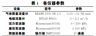 分別采用氣體質(zhì)量流量計(jì)和電磁流量計(jì)測(cè)量氣 路和水路的流量,采用羅斯蒙特壓力變送器測(cè)量氣 液路的壓力,實(shí)驗(yàn)段差壓由羅斯蒙特差壓變送器測(cè) 量.氣體質(zhì)量流量計(jì)、電磁流量計(jì)、壓力變送器和差 壓變送器由24VDC供電,輸出4~20mA電流并在 回路中串聯(lián)250Ω電阻,從回路取出的1~5V電壓 信號(hào)由與電腦相 連 的20通道IMP 采集 板 實(shí) 時(shí) 采 集,各儀器參數(shù)如表1所示.