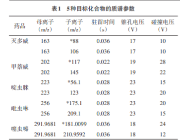 滅多威(Methomyl)、甲萘威(Carbaryl)、啶 蟲脒(Acetamiprid)、吡蟲啉(Imidacloprid)、噻蟲嗪(Thia? methoxam)。以上農藥標準品純度均大于98%,購于北京 和力順科技有限公司;乙腈(色譜純),美國TEDIA;乙酸 (AR),國藥集團;無水硫酸鎂、C18粉末、PSA粉末,農殘 級,天津博納艾杰爾科技有限公司;實驗所用純水為艾科 浦超純水系統所制。