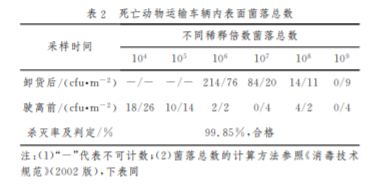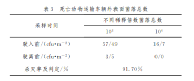 本報(bào)告選?。陛v死亡動(dòng)物運(yùn)輸車(chē)輛監(jiān)測(cè)細(xì)菌殺 滅情 況,結(jié)果表明該車(chē) 輛內(nèi)表面細(xì)菌殺滅率 ≥ 90%,具體見(jiàn)表2、表3。
