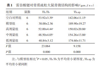 處死大鼠,分離左脛 骨,用4 %多聚甲醛固定3 d,然后10 % EDTA脫鈣5 周,用電鋸從矢狀面剖開,暴露骨髓腔并取左脛骨近 端,制備常規脫鈣骨組織蠟塊,切4 μm厚骨組織切 片,HE染色,光鏡下觀察骨形態改變,每張切片選取 5個視野,取其平均值,利用MOTIC Med 6.0型圖象分 析系統進行骨組織形態測量,計算骨形態指標:平均 骨小梁間距(Tb.sp),平均骨小梁厚度(Tb.Th)。