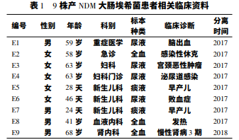 來源及臨床特征 9 株產 NDM 的 大腸埃希菌中有 4 株分離自尿液( 44. 5% ) ,3 株分離 自全血( 33. 3% ) ,2 株分離自痰液( 22. 2% ) 。其中有 3 株來自新生兒科,2 株來自門急診,血液內科、腎內 科、婦科和重癥醫學科各 1 株。患者性別、年齡及臨床 診斷等相關信息見表 1。
