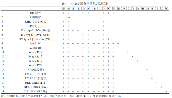根據(jù)RH基因變異體基因分型檢測試 劑盒,在擴增儀上進行基因分型試驗。將將100μL dNTP-Buffer濃縮液、140μL去離子水 、2.0μL Taq 酶(5units/μL)和 2 5μL樣本DNA共267μL混合 液;向每個引物孔(1~24孔)各加入10μL上述混合 液。擴增循環(huán)參數(shù):96℃ 2 min ,1 cycle ;96℃20 S/68℃60S ,5 cycles; 96℃20 S/65℃50S /72℃45 S,1 0 cycles;9 6℃2 0 S / 6 2℃5 0 S / 7 2℃4 5 S,2 5 cycles; 72℃2min,1 cycle。吸取5μL擴增產(chǎn)物, 加入配制好的2%瓊脂糖凝膠中并進行電泳,電泳參 數(shù)設(shè)置為電壓100V,時間15min。電泳后用凝膠成像 儀進行拍照、記錄與分析。基因分型的結(jié)果判斷見表 1。