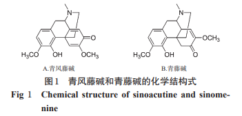 青風藤堿(Sinoacutine,結構式見圖1A)為異喹啉類 生物堿,是從防己科千金藤屬云南地不容(Stephania yunnanensis Lo)等多種植物中提取分離而得。研究發 現,青風藤堿具有鎮靜、鎮痛、抗炎、抗心律失常等活 性,例如青風藤堿能明顯提高小鼠熱板痛閾和足趾電刺 激痛閾,減少醋酸所致的小鼠扭體次數;與戊巴比妥鈉 聯用后,可增強后者的鎮靜催眠作用;此外,青風藤堿 還具有抗Ⅱ型膠原蛋白致大鼠類風濕性關節炎的作用, 并可明顯降低氯仿致小鼠室顫的發生率 。本課題組 前期研究發現,青風藤堿能明顯縮短氯化鋇致心律失常 模型大鼠恢復竇性心律所需的時間。